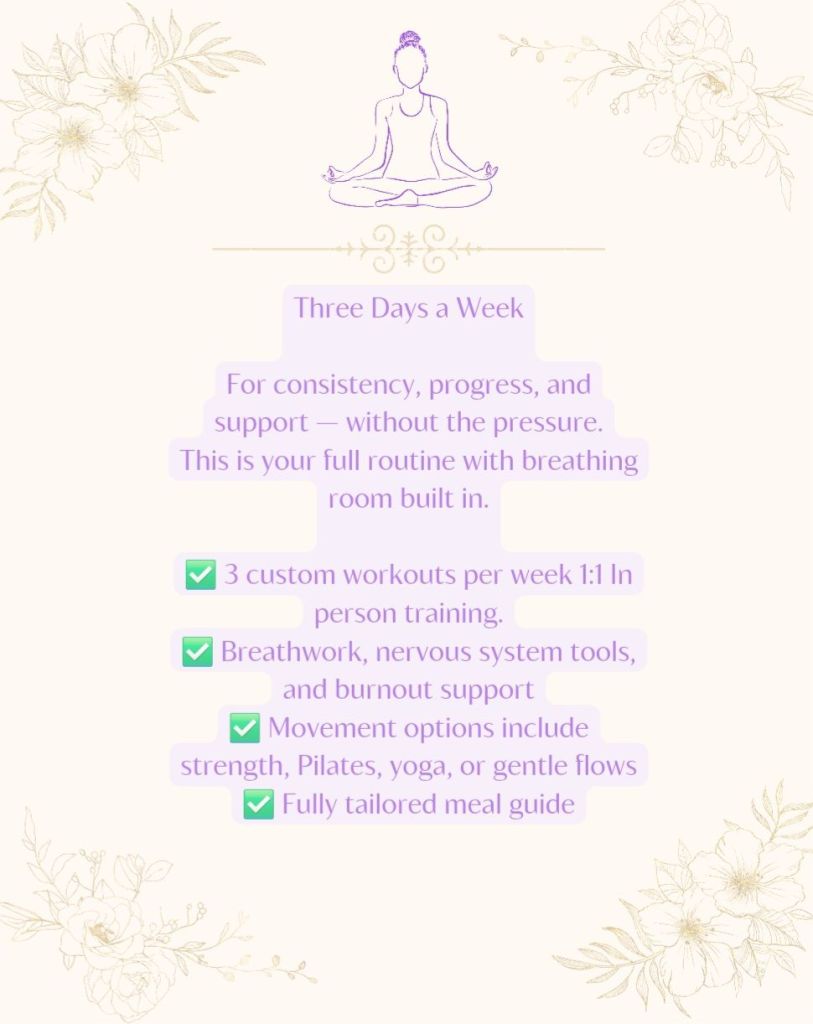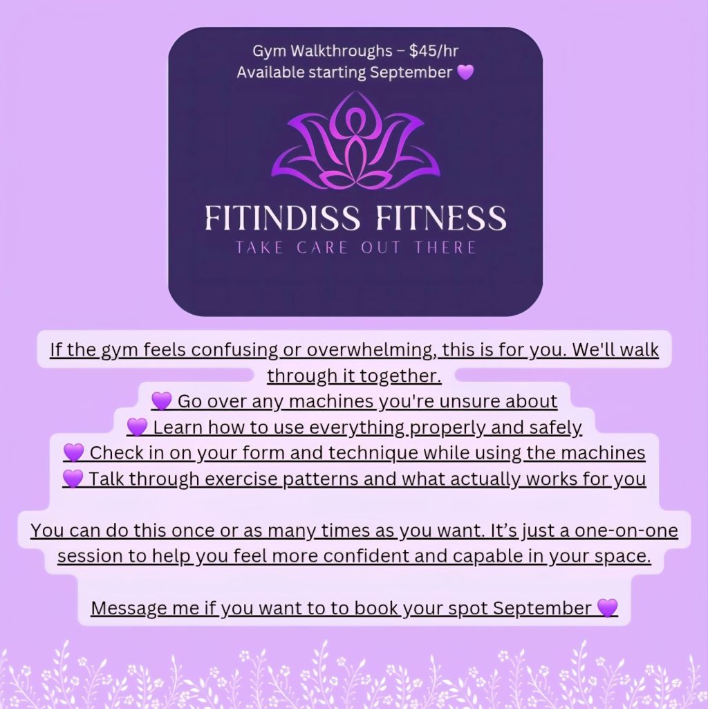 It’s just me and you, moving through the space, learning how to use each machine properly and safely, and making it all feel way less intimidating. We’ll go over form, function, and what works for your body and goals. You don’t have to figure it all out on your own.
