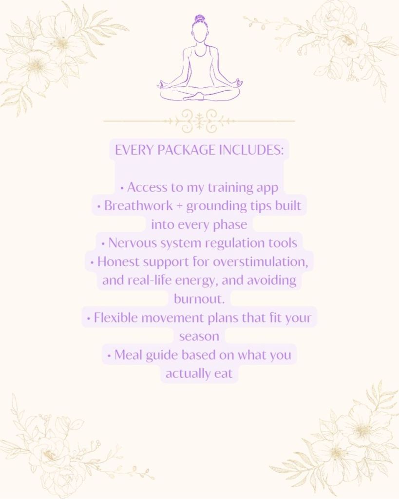Flexible meal guide options and weekly extras added inside the group on my app,  from breathwork to grounding tips to tools for regulating your nervous system.