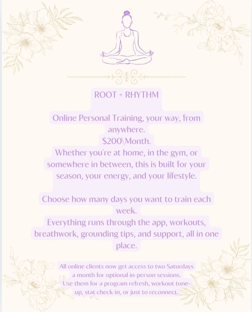 You’ll also find my online option to transition to Root + Rhythm, which is totally flexible and now with two in-person Saturday sessions available to choose from a month for all online clients.